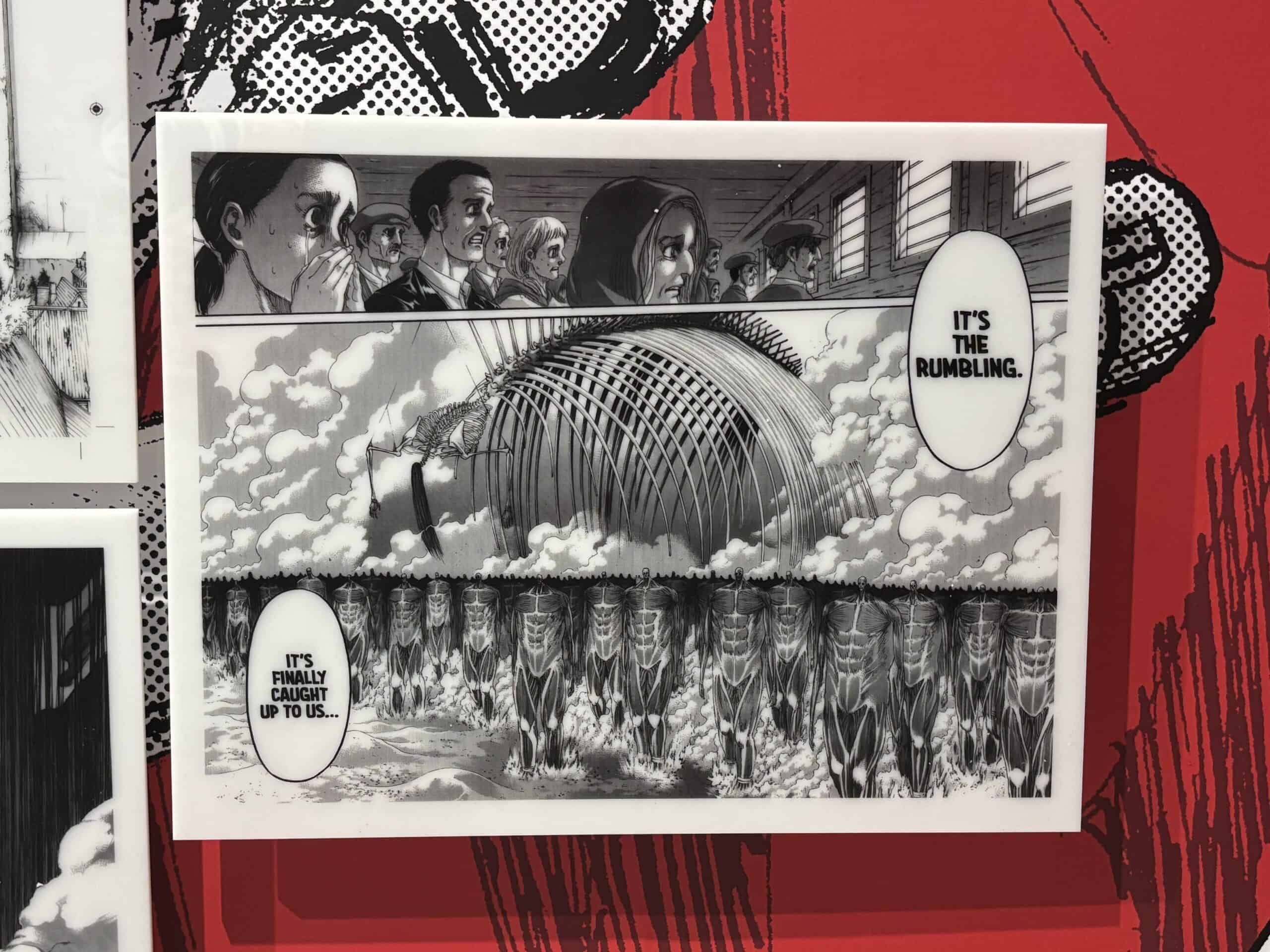 A wall panel at the Attack on Titan installation at Kodansha House in New York City, October 2025. The panel depicts “The Rumbling,” during which main character Eren Yeager reanimates hundreds of thousands of titans to destroy all life on earth outside of Paradis Island.