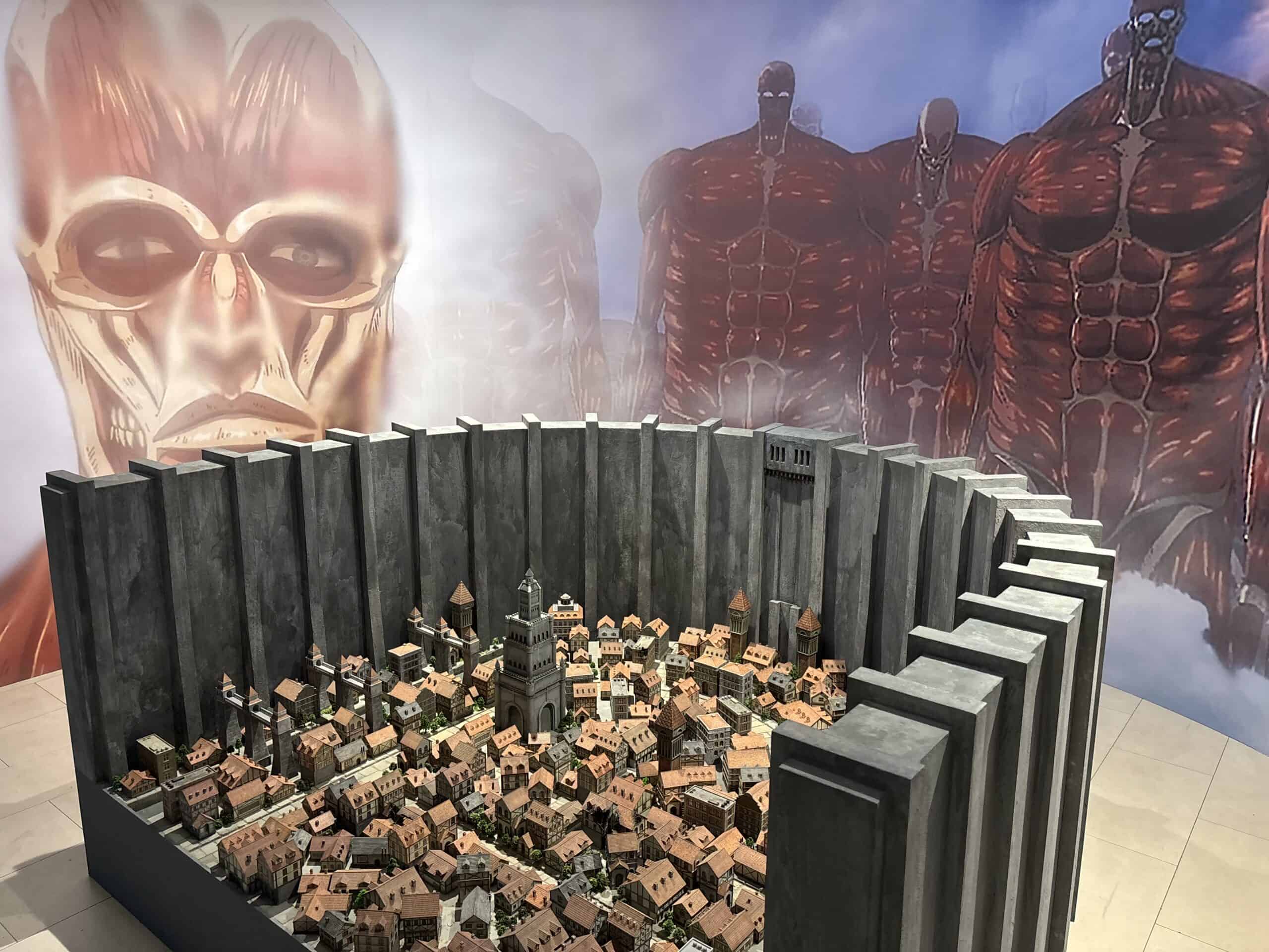 Titan’s Fury, a scaled model of a walled village as seen on Paradis Island in Attack on Titan. Installation at Kodansha House in New York City, October 2025.